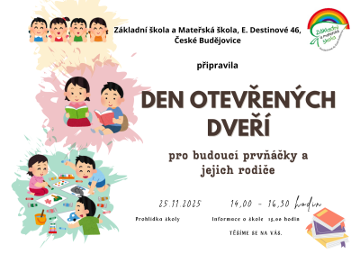 Naše škola připravila pro budoucí prvňáčky a jejich rodiče den otevřených dveří, který se uskuteční v úterý 25. 11. 2025 v čase 14:00 - 16:30.